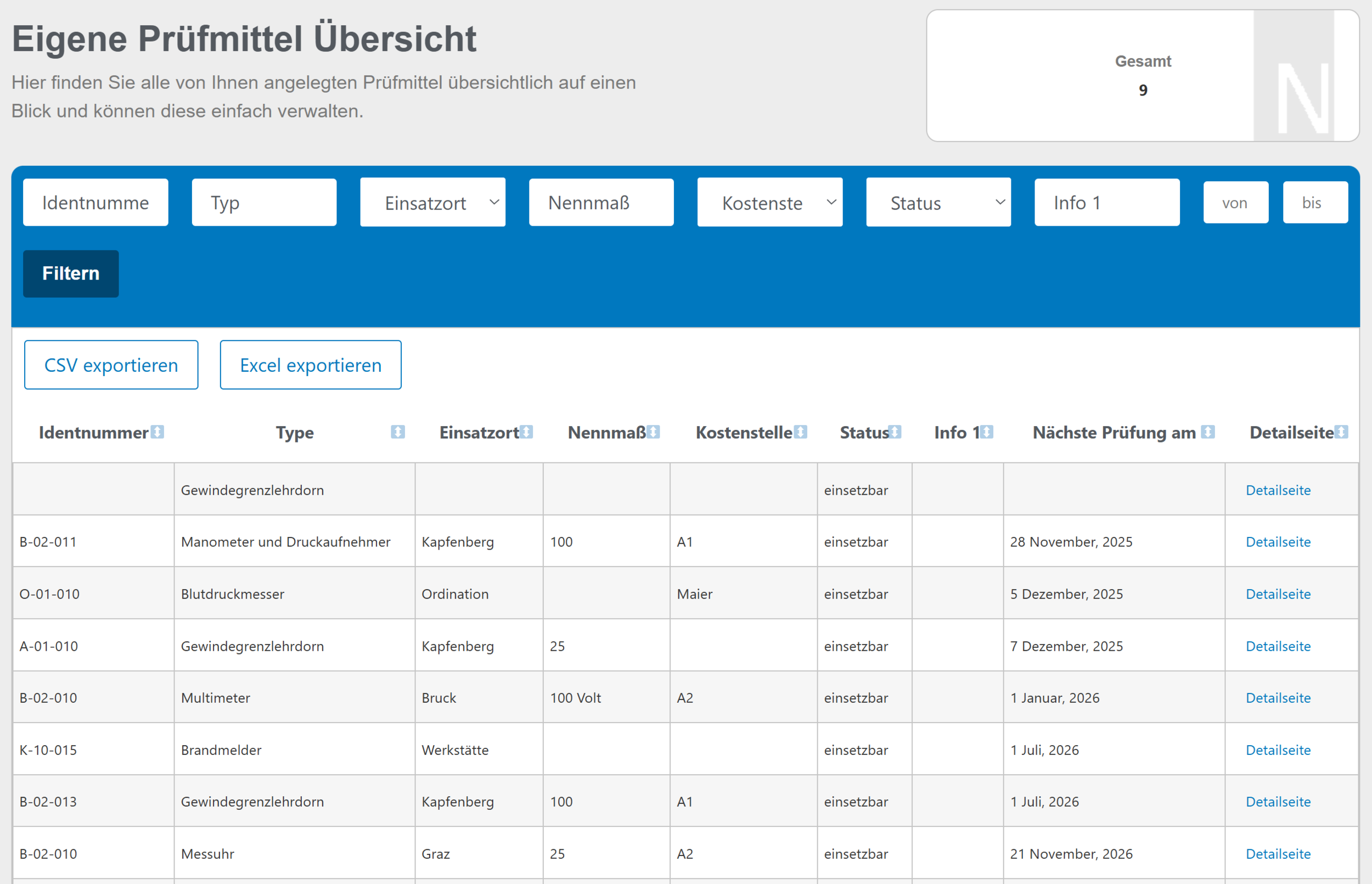 Jedes Prüfmittel, jede Anlage und jedes Gerät verfügt über eine eigene Detailansicht mit allen relevanten Informationen, Dokumenten und Prüfberichten.